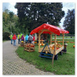 Ab 13:00 Uhr startete auf dem Kirchhof das Familienfest, bei dem die ältere Generation gerne im Schatten der Bäume zusammensaß. Für Leben und Aktivität sorgten die vielen Kinder. Das Museumsteam lockte sie erst mit Rätselspielen durch die Ausstellung, dann gab es zur Belohnung Waffeln am Spieß und Schminken als Prinzessin, Tiger, Löwe oder Traumkind. Sowohl bei der Pflanzensuche auf der Museumswiese, als auch am Handwerkerstand für das Basteln von Insektenhotels, war der Andrang groß. Alle Helferinnen und Helfer, auch beim Mal- und Stickerstand, hatten über den ganzen Nachmittag alle Hände voll zu tun. Als die Feier gegen 18:00 Uhr zu ihrem Ende kam, schauten viele Besucher noch gerne auf die Fotoschau, die im Schaufenster des Museums über einen großen TV-Bildschirm lief.