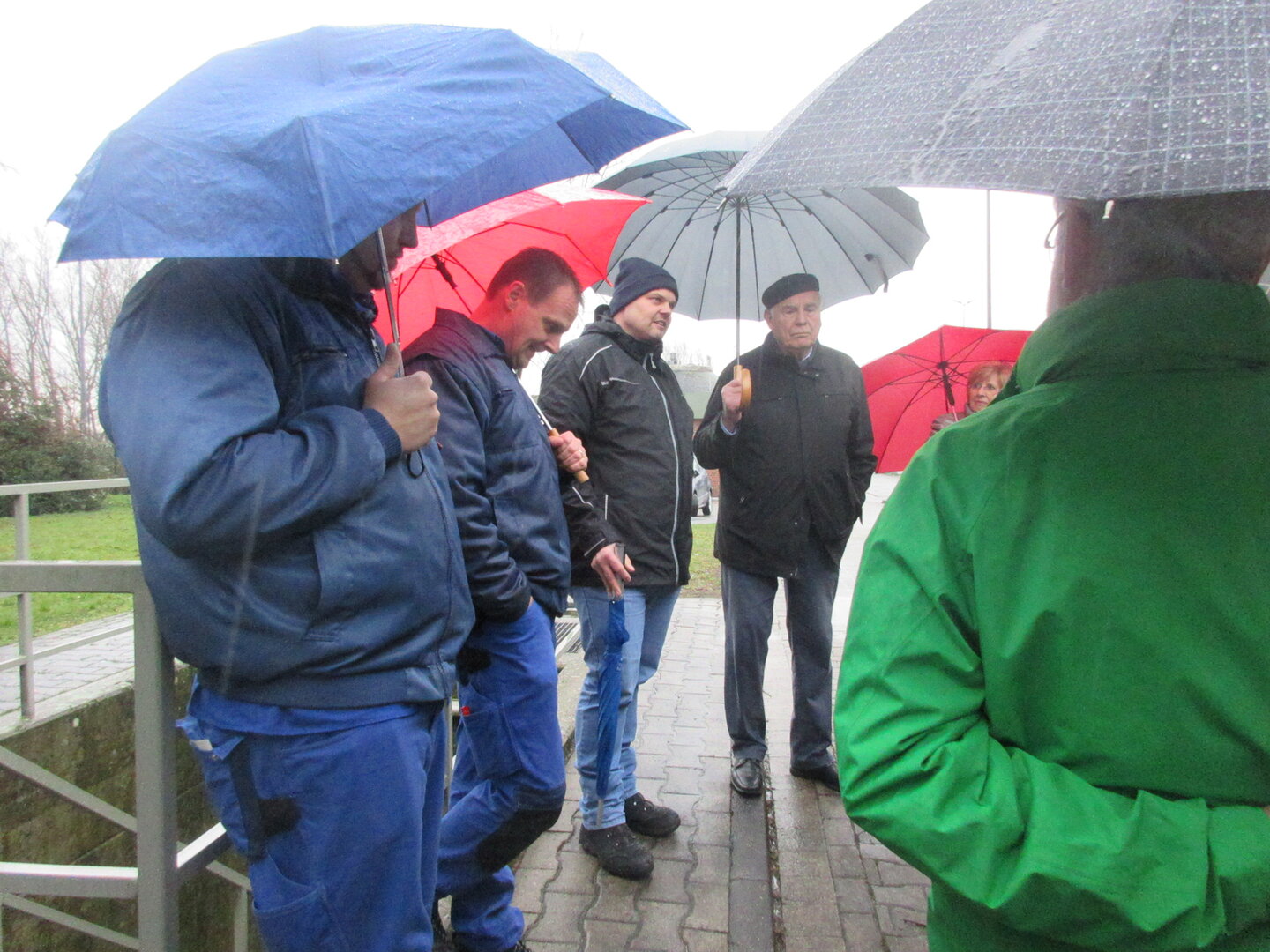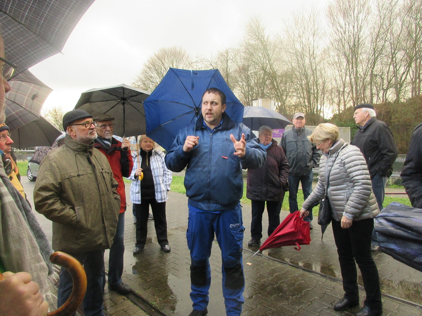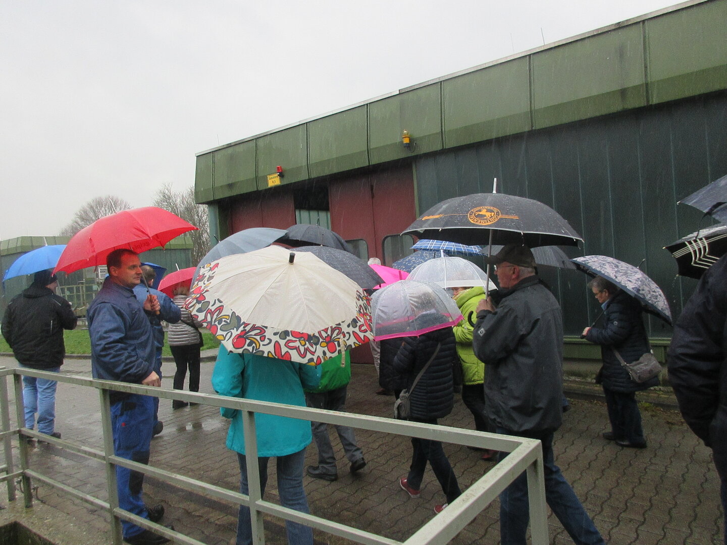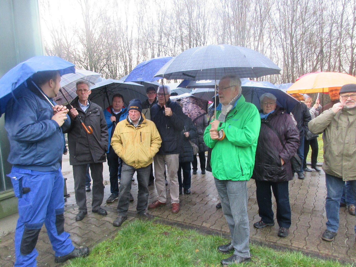 Bei Dauerregen und Temperaturen um 6 Grad versammelten sich 30 Mitglieder vor dem Klärwerk am Südring, um die weitläufige Anlage zu besichtigen. Von den Herren Ogonek und Müller vom Lippeverband, der die Kläranlage betreibt, erfuhren die Mitglieder viel Interessantes über die hintereinander geschalteten einzelnen Stufen der Aufbereitung der Abwässer aus Werne und Rünthe. Wilko Böcker, zuständig im Baudezernat der Stadt Werne und dort zuständig für die Wasserentsorgung in Werne, gab grundsätzliche Informationen über das weit verzweigte Kanalsystem in Werne, das auch über einige Pumpstationen verfügt, an denen das Abwasser in ein höher gelegenes Netzsystem befördert wird, um dadurch besser den Weg zur Klärstation am Südring zu finden.