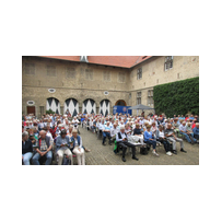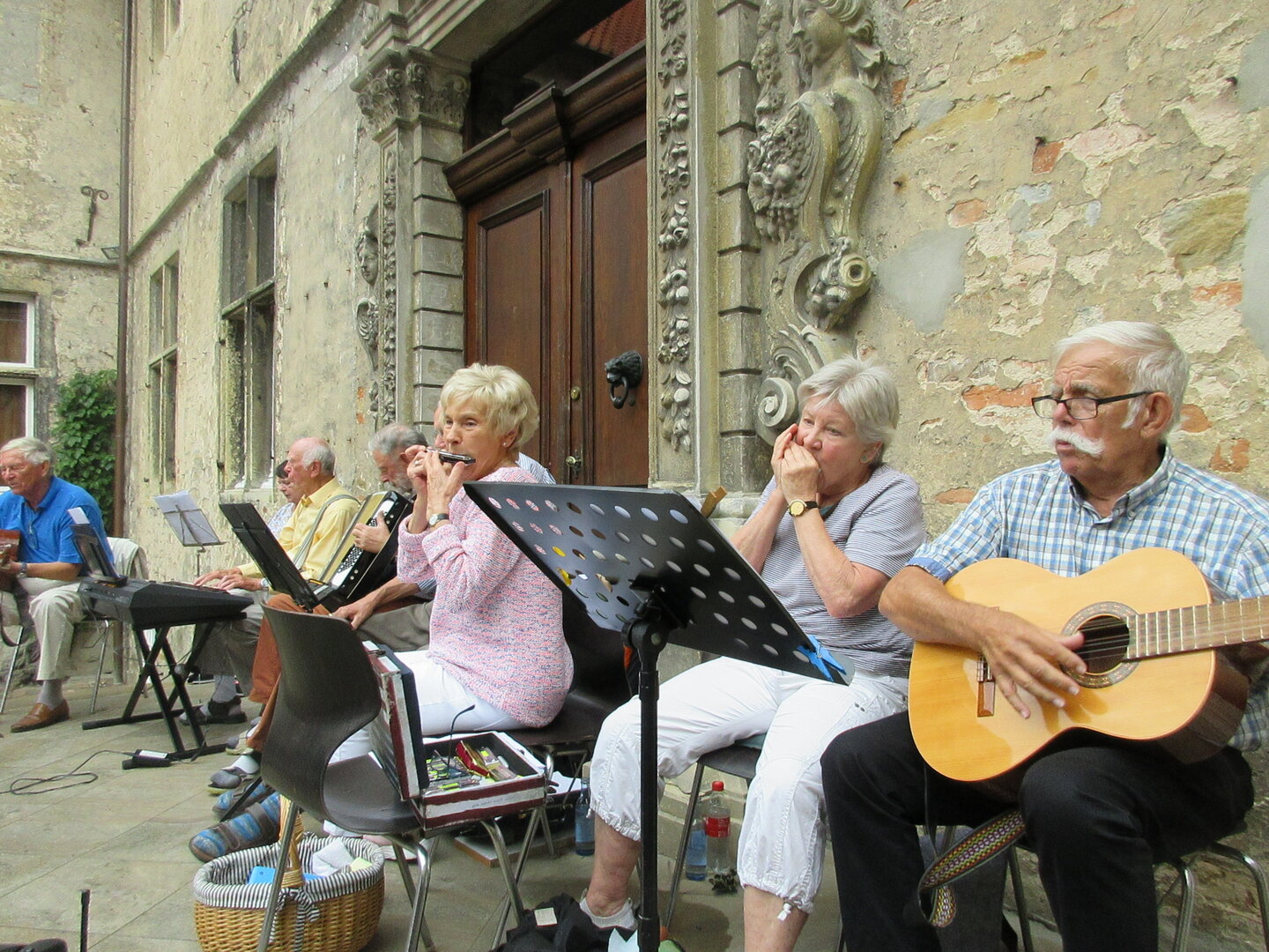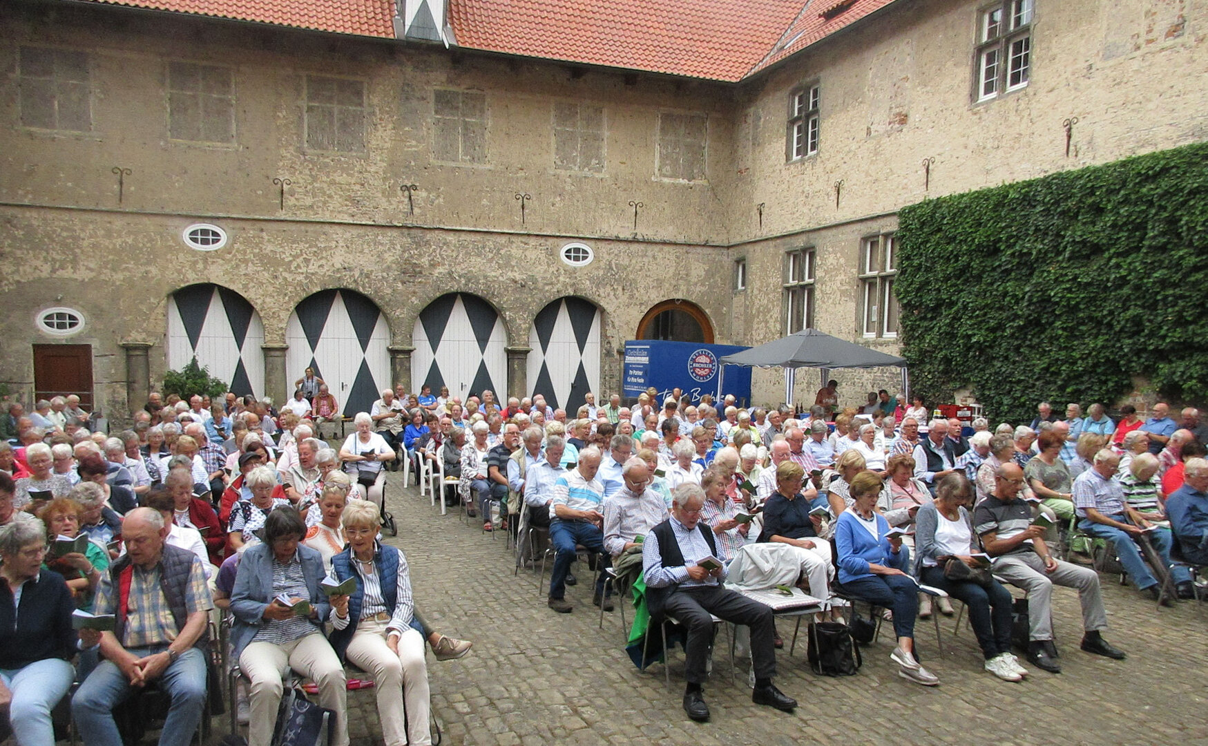 Trotz der negativen Wettervorhersagen fanden sich etwa 200 Heimatfreunde zum Offenen Singen im Innenhof von Schloss Westerwinkel ein. Die Gemeinschaftsveranstaltung der Heimatvereine Herbern und Werne stand unter dem Motto "Geh´ aus mein Herz und suche Freud" und erlebte in diesem Jahr ihre 18. Auflage. Wie in allen Jahren führte Christel Homann vom Heimatverein Herbern durch das Programm. Unter Anwesenheit des Hausherrn Graf von Merfeldt wurden bekannte Volks- und Wanderlieder gesungen, darunter auch Kanons, die von Elisabeth Schulte in gekonnter Weise dirigiert wurden. Unterstützt wurden die Sängerinnen und Sänger durch die Instrumentalgruppe des Heimatvereins Werne. Das waren in diesem Jahr unter Leitung von Gisbert Fleischer am Keyboard, Hans-Werner Hein am Akkordeon, mit Gitarren Karl-Heinz Stengl und Heiner Ernst (HV Heessen). Egon Dellwig, Ute Teubener und Marlene Grote (HV Heessen) waren mit ihrer Mundharmonika und Ulrike Hutzler mit ihren Flöten dabei. In der Pause, in der die Sangesfreunde vom Heimatverein Herbern mit Getränken versorgt wurden, setzte der vorausgesagte Regen ein und so klang der Liederabend gegen 20 Uhr stimmungsvoll mit dem Lied "Kein schöner Land" aus.