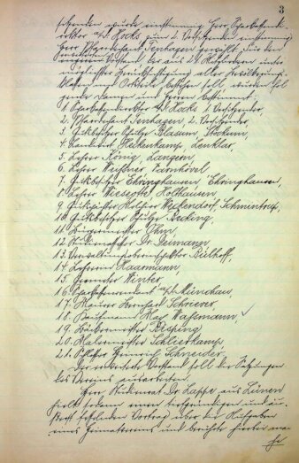Anwesend: Bürgermeister Ohm, Pfarrdechant Tenhagen, Fräulein Haarmann, Fräulein Pohlkötter, Rektor Rentmeister, Paul Adam, Rottmann, Langenberg, Vikar Pellmann, Hocks, Lehrer Meyer, Bülhoff, Dr. Deimann, Ehringhausen Gutsbesitzer, Lindt, Weißner, Wieseotte, Dornhegge, Henning, Bramkamp, Beckmann Bernhard, Waßmann Max, Münchau, Weckermann Stockum, Höcker.