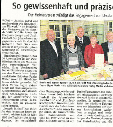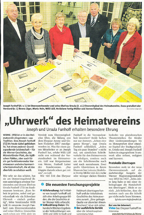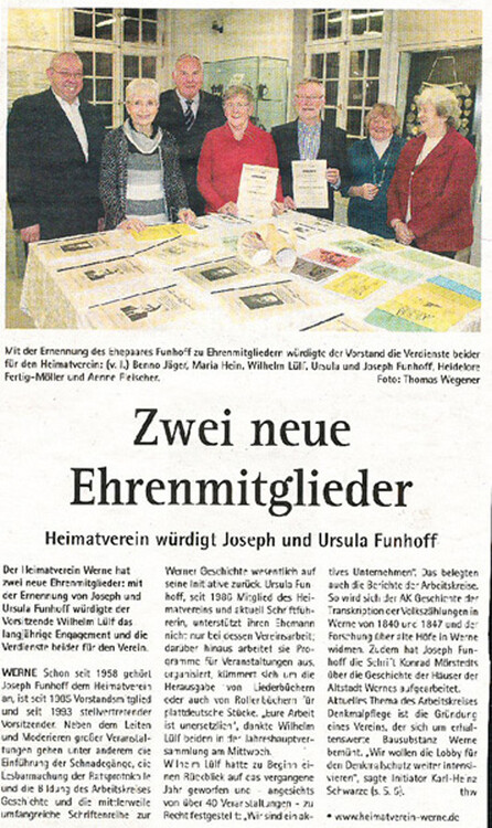 Eine besondere Ehre wurde dem Heimatverein Werne zuteil, indem Josef Bernsmann als Repräsentant des Heimatgebietes Münsterland unserem 1. stellvertretenden Vorsitzenden Joseph Funhoff eine Ehrenurkunde des Westfälischen Heimatbundes anlässlich unseres 90jährigen Jubiläums überreichte.