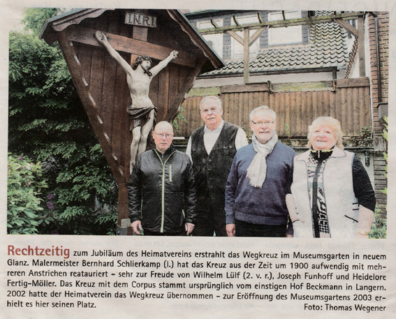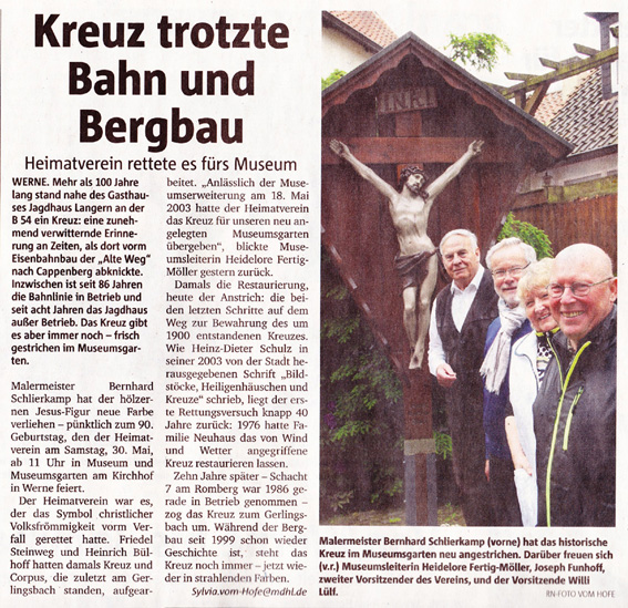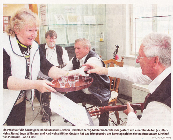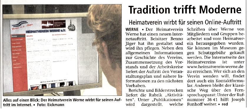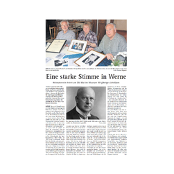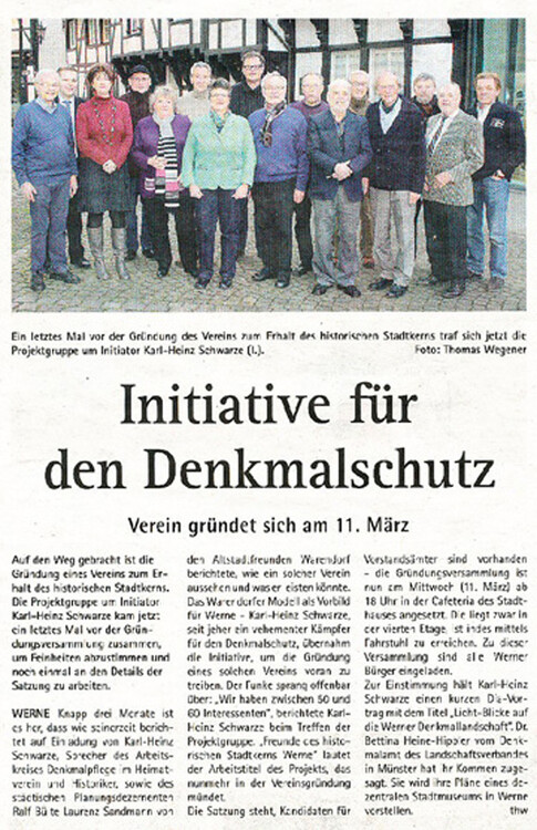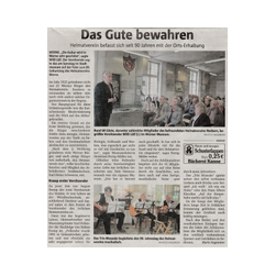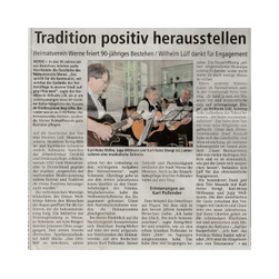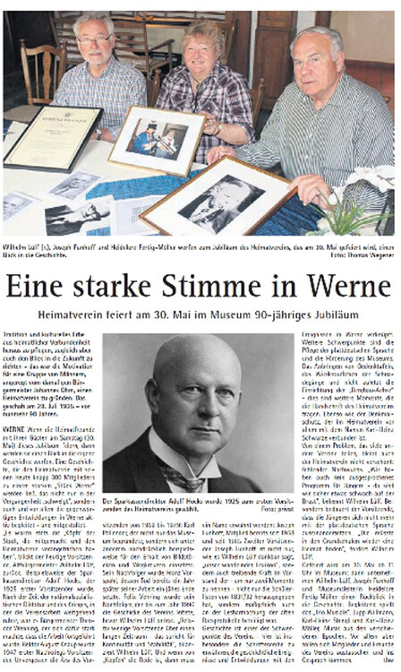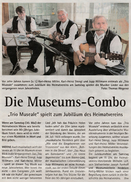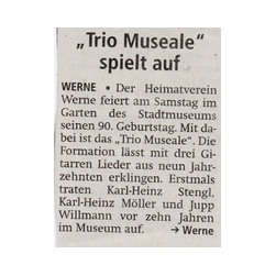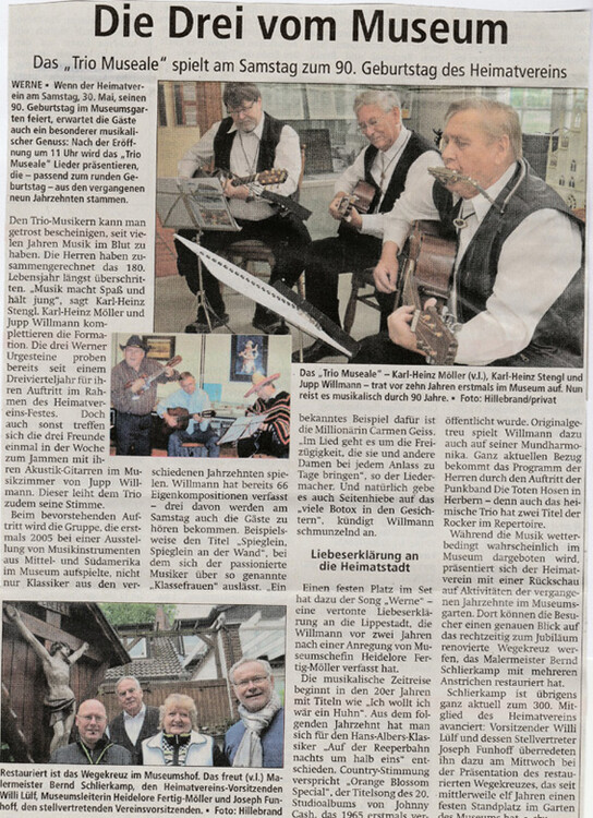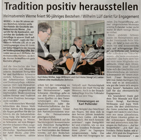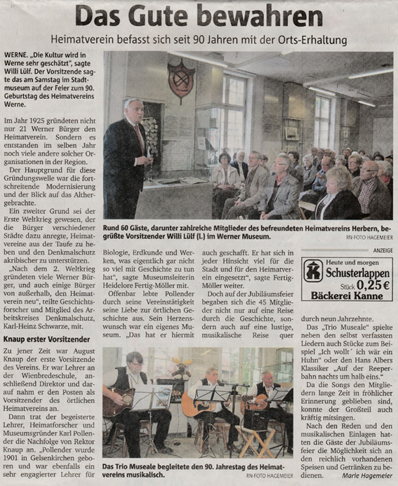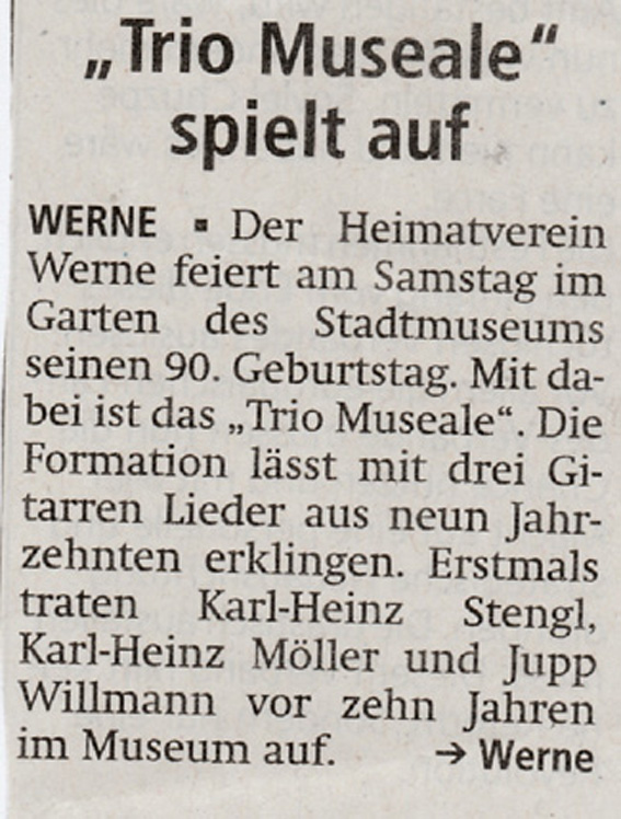 In diesem Jahr besteht der Heimatverein Werne 90 Jahre. Im Rahmen einer Matinee im Stadtmuseum wurde dies zum Anlass genommen, auf die vergangenen Jahre und deren Geschichte Rückschau zu halten. Entsprechende Beiträge hatten der 1. Vorsitzende Wilhelm Lülf, seine Stellvertreterin Heidelore Fertig-Möller und der Sprecher des Arbeitskreises "Ortsbild- und Denkmalpflege" Karl-Heinz Schwarze vorbereitet. Den musikalischen Rahmen übernahmen die Combo "Trio Museale", die mit Musikstücken aus 90 Jahren aufwarteten. Der Abschluss fand im Museumsgarten statt.