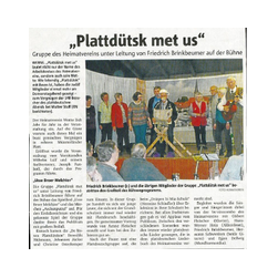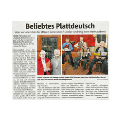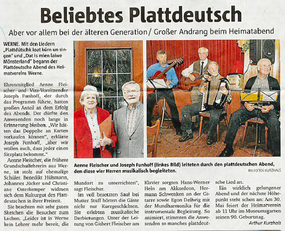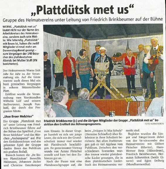 Der Heimatverein hatte zum diesjährigen "Plattdeutschen Abend" bei Mutter Stuff eingeladen. Mehr als 140 Mitlgieder kamen und erlebten ein bunt gemischtes Vergnügen in echtem Münsterländer Platt. Eröffnet wurde die Veranstaltung vom Vorsitzenden Wilhelm Lülf und seinem Stellvertreter Joseph Funhoff, der auch durch das Programm führte. Die Gruppe "Plattdütsk met us" unter Leitung von Friedrich Brinkbeumer führte auf der Bühne das Spiellied "Usse Broer Melchior" und das Märchen "Aschenputtel" auf. Für den Einfallsreichtum und das gekonnte Spiel der Gruppe wurde ihnen durch großen Beifall gedankt. Danach kam die "De lästen Plattdütsken" Benedikt Hülsmann, Johannes Jücker und Christine Osterkemper zum Einsatz. In dieser Gruppe handelt es sich um junge Leute, die sich seit der Grundschulzeit immer mal wieder mit Plattdeutsch beschäftigen. Ihr gemeinsamer Vortrag wurde von Aenne Fleischer erstellt und kam bei den Zuhörern gut an. Nach der Pause trat die Plattdeutschgruppe auf, die bei "Driäpen bi Mai Schulz" (Hermine Schindler) über Erlebnisse ihrer Schulzeit berichteten. Bei allen Darbietungen gab es viel Applaus vom Publikum. Zwischen den verschiedenen Szenarien wurden immer wieder plattdeutsche Lieder gesungen, die in dem plattdeutschen Liederbuch des Heimatvereins vermerkt sind. Begleitet wurden die Sänger und Sängerinnen dabei von der Vereinscombo mit Gisbert Fleischer (Klavier), Hans-Werner Hein (Akkordeon), Friedrich Brinkbeumer, Hermann Schwenken (bei Gitarre) und Egon Dellwig (Mundharmonika).