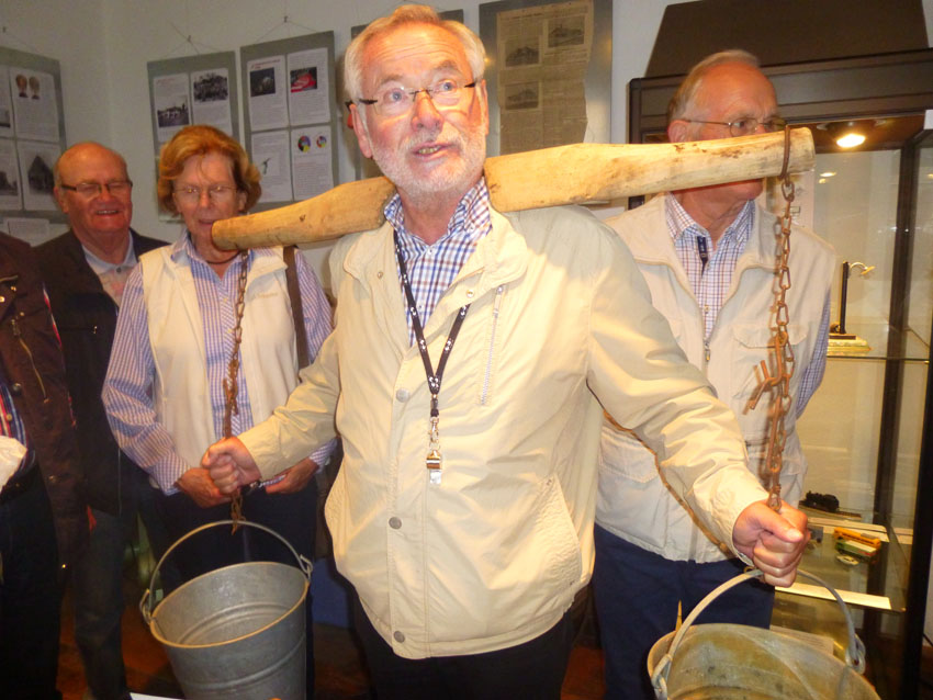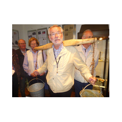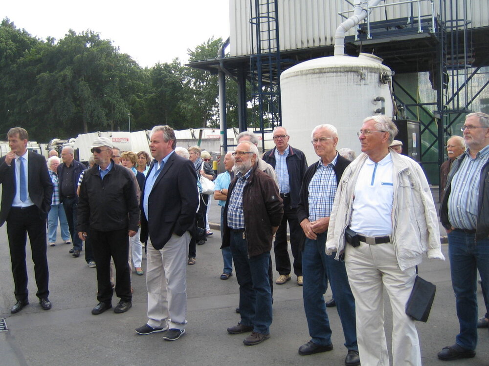 Danach fuhren wir mit dem Bus zur fast neuen Biovergärungsanlage in Witten-Bebbelsdorf. Nach einer Stärkung bei Kaffee und Kuchen wurden die Heimatfreunde in modernste Technik der Verarbeitung der Bio-Tonnen-Inhalte eingeführt. Ein Film informierte über die komplexen Abläufe in der Anlage am Standort. Diese wurde im Auftrag des Ennepe-Ruhr-Kreises erstellt. Es wird der Bioabfall nicht einfach kompostiert, sondern in einem großen Fermenter unter Luftabschluss vergärt. Dieses Verfahren hat als Endprodukt neben Kompost eine weitere Komponente. Das hier umweltfreundlich produzierte Biogas wird in zwei Blockheizwerken verstromt. Der Strom wird in das vorhandene Netz eingespeist. Man erfuhr, dass die Strommenge ausreicht, um ca. 2000 Haushalte zu versorgen. Mit der Gewinnung des Öko-Stroms in Witten wird durch das geschlossene Verfahren erreicht, das viele Tausend Kubikmeter Methangas, man sprach von ca. 3 Millionen Kubikmeter Jahresmenge, nicht in die Umwelt gelangen und diese deshalb nicht belastet.