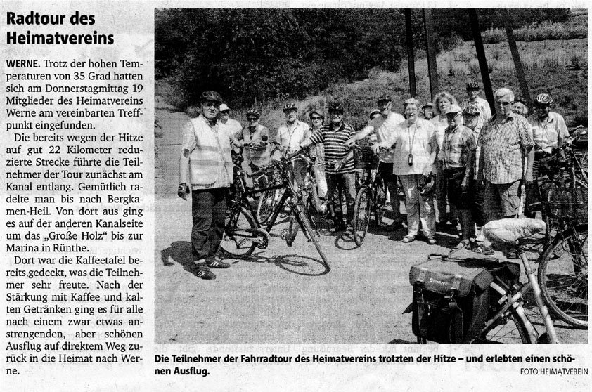 Mit 28 Teilnehmern wurde die diesjährige Fahrradsaison eröffnet. Unter Leitung von Erika Brokamp ging die 22 Kilometer lange Strecke über Holthausen und Horst weiter über Bockum nach Stockum wo in der Panhoff-Stiftung Einkehr gehalten wurde. Bei Kaffee und Kuchen stärkten sich die Heimatfreunde für die restlichen 5 Kilometer, die über die neue Fahrradstrecke entlang der früheren Zechenbahntrasse zurück nach Werne führte. Diese Fahrten ins Blaue finden während der Sommermonate an jedem ersten Donnerstag eines Monats statt und beginnen jeweils um 14.00 Uhr am Parkplatz der RWE an der Goerdelerstraße.
