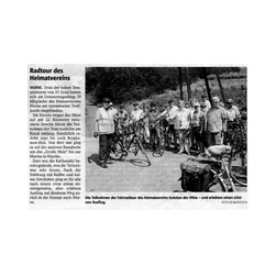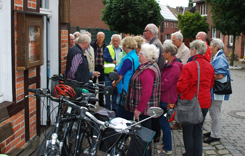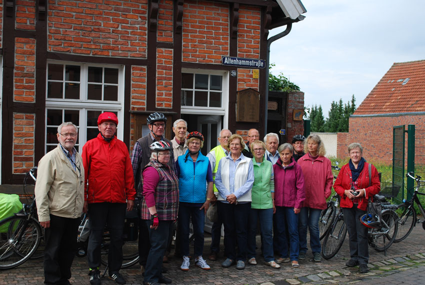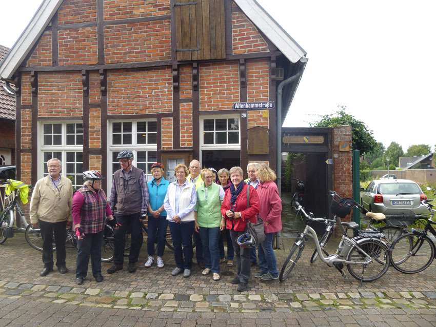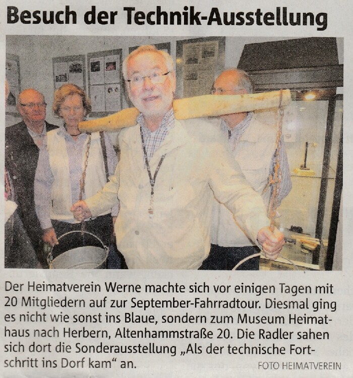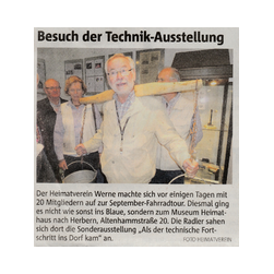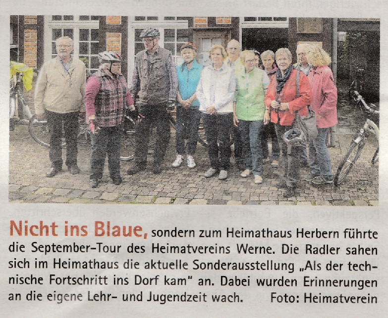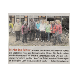 20 Mitglieder machten sich auf zur September-Fahrradtour. Diesmal ging es nicht ins Blaue sondern gezielt zum Heimathaus nach Herbern. Über die Werner Bauernschaften Holthausen, Horst und Wessel ging es weiter durch die Herberner Bauernschaft Ondrup zum Heimathaus an der Altenhammstraße. Dort wurden wir von Josef Bernsmann und Christel Homann vom Vorstand des Heimatvereins Herbern begrüßt. Die Radler sahen sich im Heimathaus die diesjährige Sonderausstellung "Als der technische Fortschritt ins Dorf kam" an und waren davon sehr angetan. Bei vielen Betrachtern kamen Erinnerungen aus der Lehr- und Jugendzeit auf. Vom Heimathaus führte der Weg weiter über Westerwinkel zum Restaurant "Zur Brücke" in Capelle, wo die Kaffeetafel bereits gedeckt war. Von dort ging es auf direktem Weg zurück nach Werne.