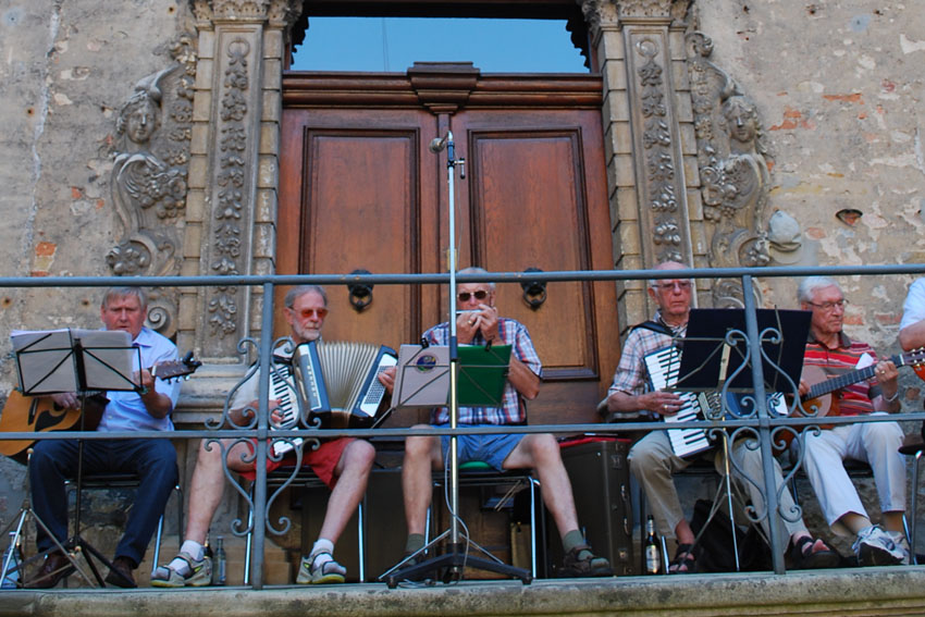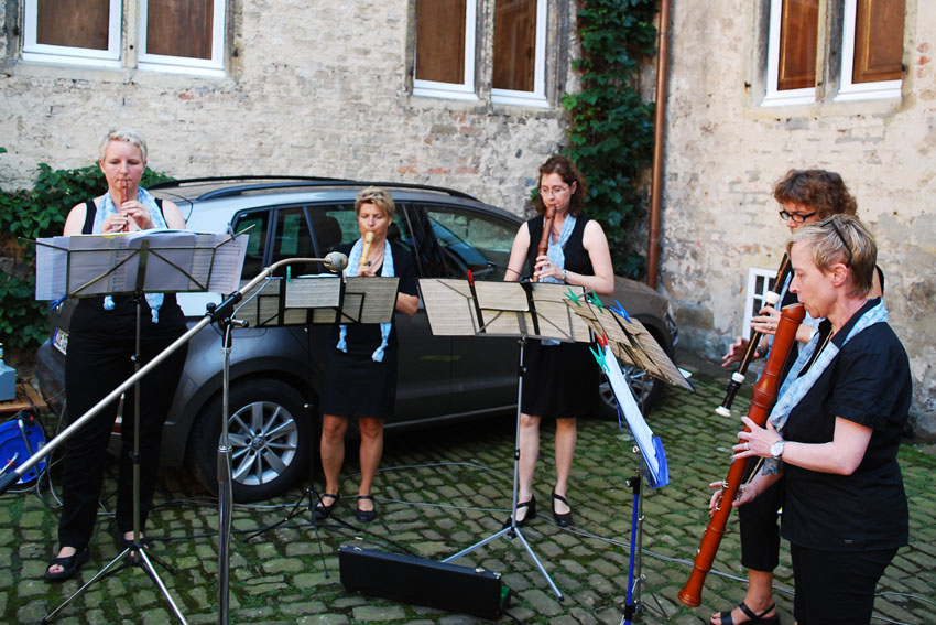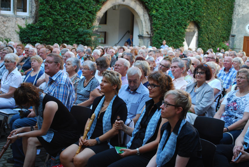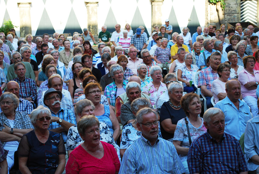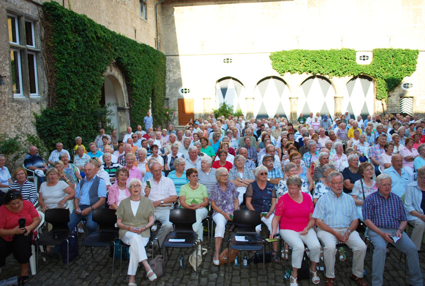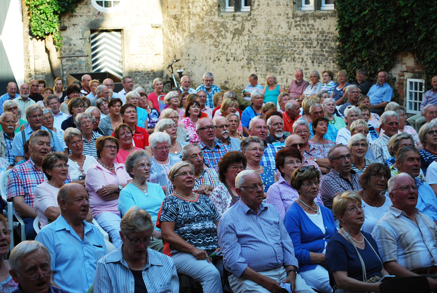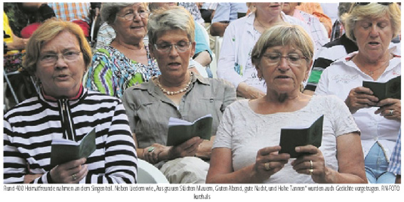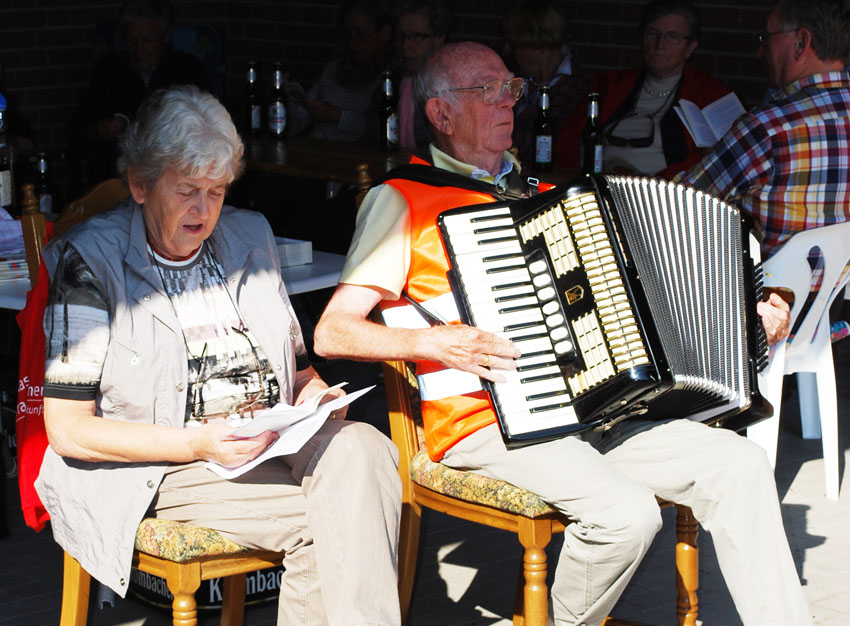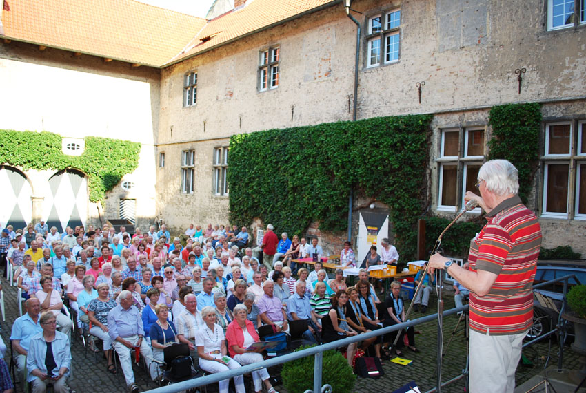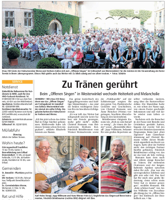 Zirka 350 Sangesfreunde trafen sich im Innenhof des Schlosses Westerwinkel zum "Offenen Singen". Die Organisation und die Leitung der Veranstaltung hatte wie schon in den Vorjahren der Heimatverein Herbern übernommen. Die Moderation übernahm Christel Homann, die selbst auch mit Gedichtvorträgen und einem Lied zum Gelingen persönlich beitrug. Den musikalischen Rahmen gestaltete wiederum die Musikgruppe unseres Heimatvereins um Gisbert Fleischer. Aus Herbern trug eine Damengruppe mit ihren Flöten zum Gelingen bei. Aenne Fleischer trug einige plattdeutsche Stücke vor.
