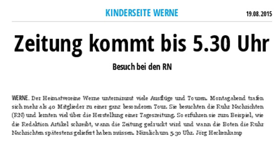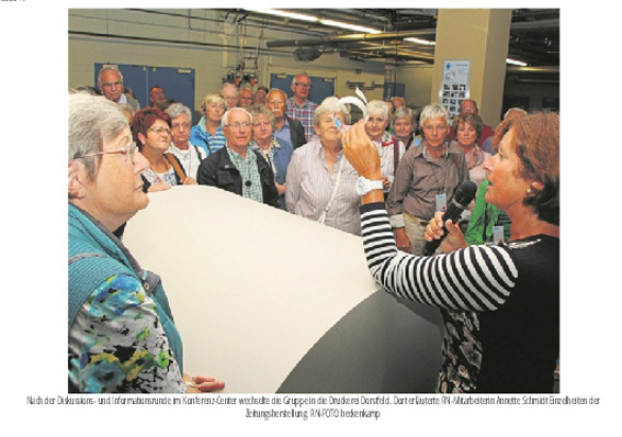 Mit 42 Interessierten fuhren wir zum Leserabend der Ruhr Nachrichten nach Dortmund, wo uns Chefredakteur Hermann Beckfeld mit seinem Team begrüßte. Es schloss sich eine Fragestunde an, wo jeder die Möglichkeit hatte, Hinweise zur Arbeit der Zeitung zu geben - aber auch Kritik zu üben. Hiervon wurde reichlich Gebrauch gemacht. Für Fragen stand auch der Leiter der Lokalredation Werne, Herr Jörg Heckenkamp, zur Verfügung. Nach einer kleinen Stärkung ging es mit dem Bus weiter zum Druckzentrum in Dortmund-Dorstfeld, wo wir die Erstellung der ersten Ausgabe des Folgetages beobachten konnten. Eine Mitarbeiterin erklärte uns die technischen Hintergründe. Mit vielen interessanten Eindrücken ging es zurück nach Werne.