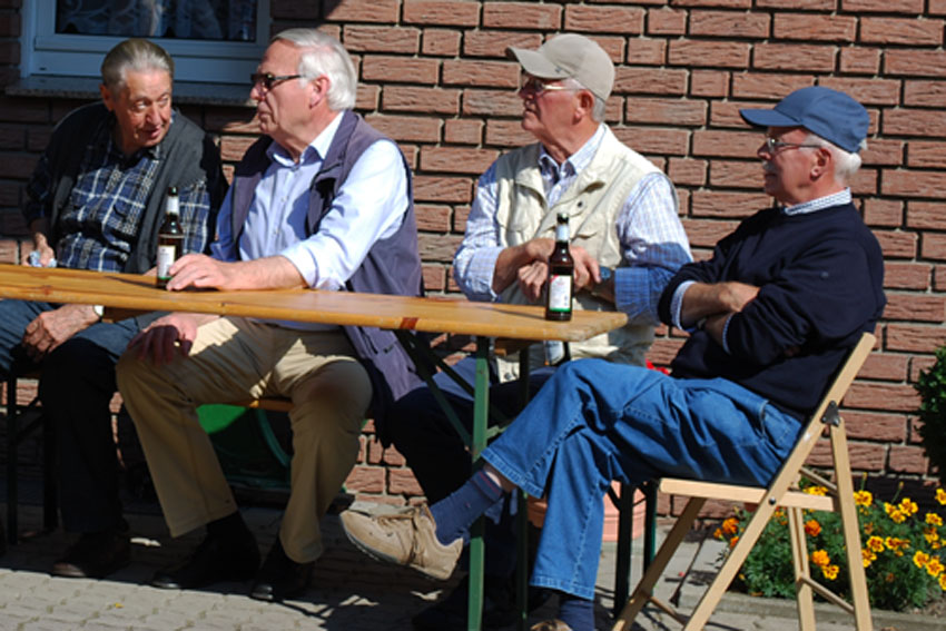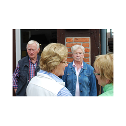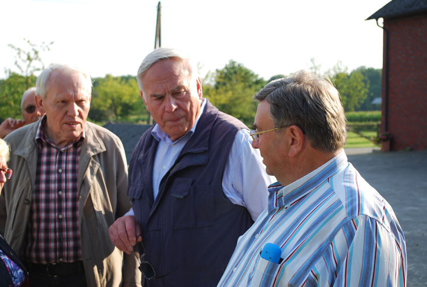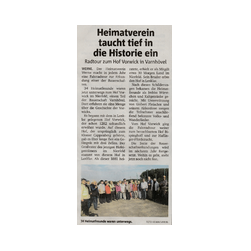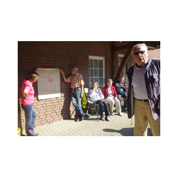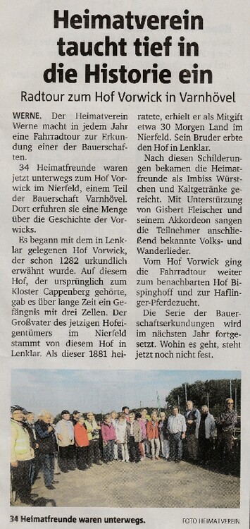 Wie in jedem Jahr machten wir eine Fahrradtour zur Erkundung einer unserer Bauernschaften. 34 Heimatfreunde fuhren zum Hof Vorwick ins Nierfeld, einem Teil der Bauernschaft Varnhövel. Dort erfuhren die Teilnehmer durch einen Vortrag des stellvertretenden Vorsitzenden Joseph Funhoff eine Menge über die Geschichte der Vorwicks. Er begann dabei mit dem in Lenklar gelegenen Hof Vorwick, der schon 1282 urkundlich erwähnt wird und die Keimzelle der Vorwicks darstellt. Auf diesem Hof, der ursprünglich zum Kloster Cappenberg gehörte, gab es über lange Zeit ein Gefängnis mit drei Zellen. Der Großvater des jetzigen Hofeigentümers im Nierfeld stammt von diesem Hof in Lenklar. Als dieser 1881 heiratete, erhielt er als Mitgift ca. 30 Morgen Land im Nierfeld. Sein Bruder erbte den Hof in Lenklar. Dessen Sohn verkaufte Anfang des 20. Jahrhunderts an die Bergwerk- gesellschaft Dahlbusch. Anhand von Plänen berichtete anschließend unser Vorsitzende Wilhelm Lülf über damalige Dahlbusch- und Bergwerksvorhaben in Lenklar und Langern. Nach den Schilderungen sassen die Heimatfreunde gemütlich beisammen. Mit Unterstützung durch Gisbert Fleischer am Akkordeon wurden gemeinsam bekannte Volks- und Wanderlieder gesungen.