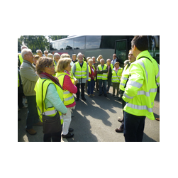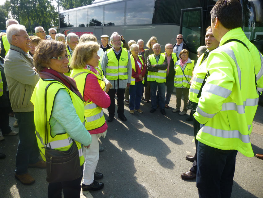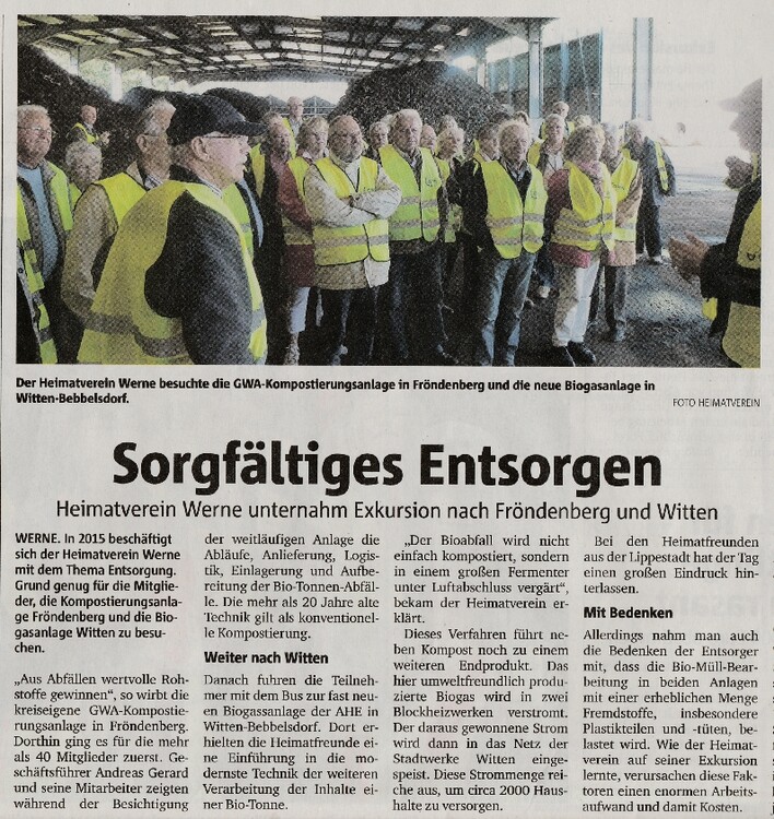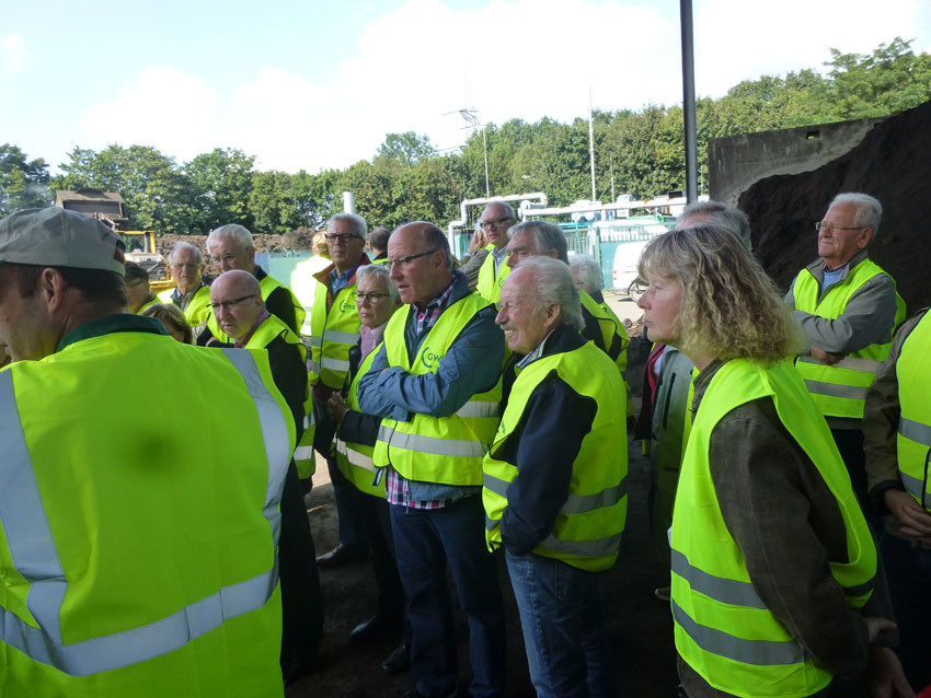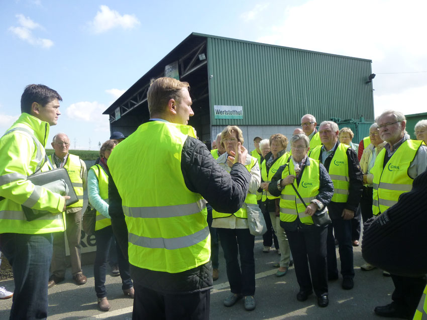 Im Jahre 2014 haben wir uns mit dem Thema "Versorgung" unserer Stadt mit Strom, Wasser und Gas beschäftigt. In diesem Jahr mit dem Thema "Entsorgung". Es bot sich die Gelegenheit, mit mehr als 40 Mitgliedern eine Exkursion zu gestalten. "Aus Abfällen wertvolle Rohstoffe gewinnen" - so wirbt die kreiseigene GWA-Kompostierungsanlage in Fröndenberg. Dieses Ziel wurde angesteuert. Der Geschäftsführer Andreas Gerard und seine Mitarbeiter zeigten während der Besichtigung der weitläufigen Anlage die Abläufe, Anlieferung, Logistik, Einlagerung und Aufbereitung der Bio-Tonnen-Abfälle. Die mehr als 20 Jahre alte Technik gilt als konventionelle Kompostierung.