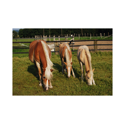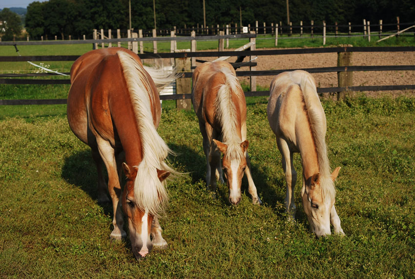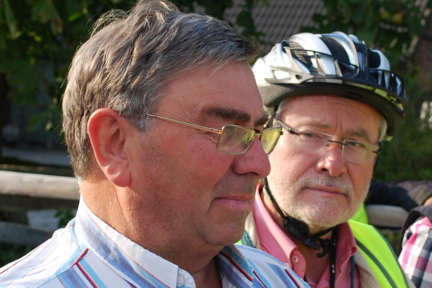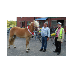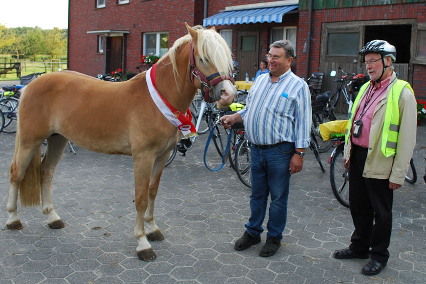 Vom Hof Vorwick ging die Fahrradtour weiter zum benachbarten Hof Bispinghoff. Dort unterhält Heinz Bispinghoff eine sehr erfolgreiche Hafflinger-Pferdezucht. Mit Stolz konnte er berichten, welche großen Preise er mit seinen Deckhengsten und Zuchtstuten erringen konnte. Zwei der heute dort stehenden Deckhengste holte er aus dem Stall und präsentierte die prächtigen Tiere den interessierten Teilnehmern.
