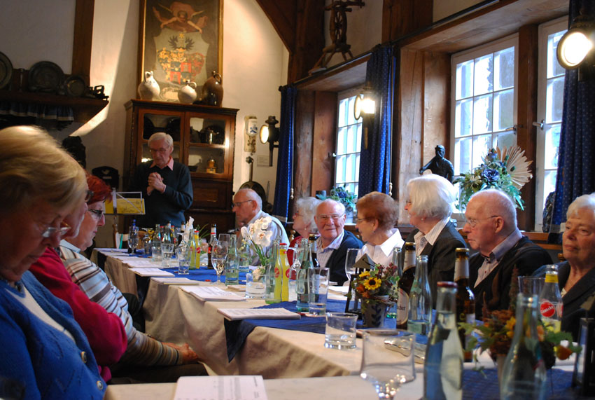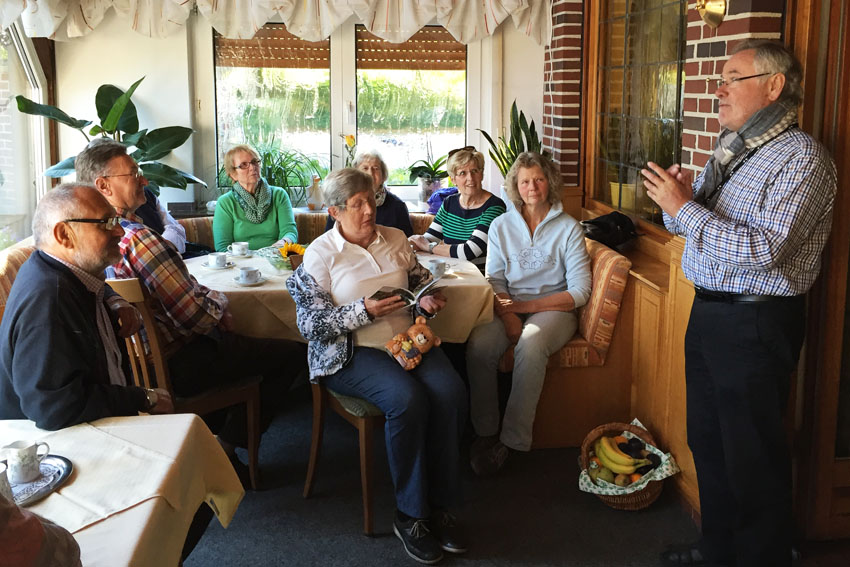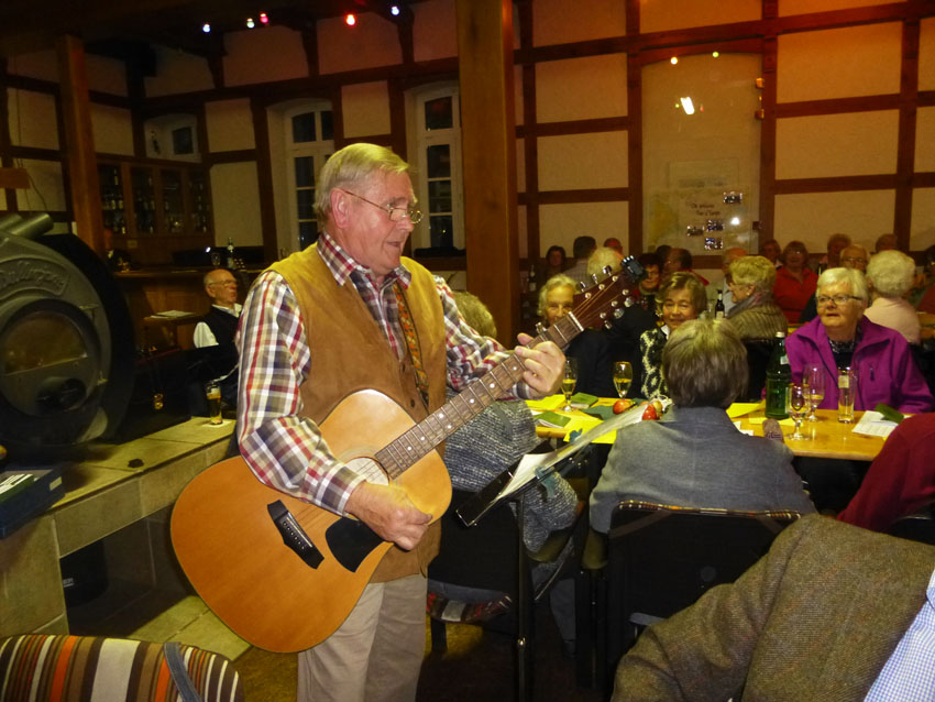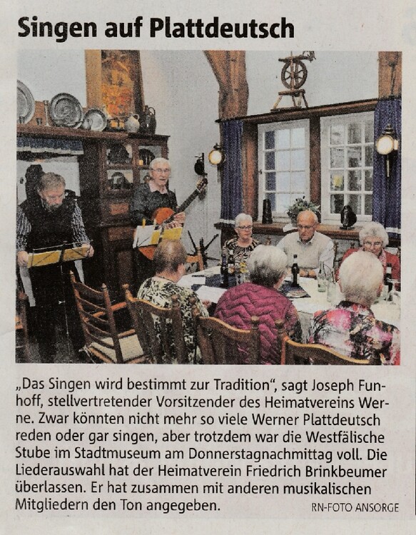 Donnerstag, 12. November 2015Bis auf den letzten Platz besetzt war die Westfälische Stube des Stadtmuseums, als es auch in diesem Jahr hieß: "Plattdeutsches Liedersingen". Die Begrüßung der Gäste übernahm der 2. Vorsitzende Joseph Funhoff. Durch den Nachmittag führte der Leiter der Gruppe "Plattdütsk met us" Friedrich Brinkbeumer. Er sagte nicht nur die Lieder an, sondern ergänzte sie mit humorigen Anekdoten. Unterstützt wurde der Gesang der Mitglieder und Freunde von der Vereinscombo um Gisbert Fleischer. Aenne Fleischer reicherte den Nachmittag mit eigenen Gedichten an.