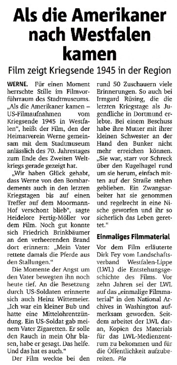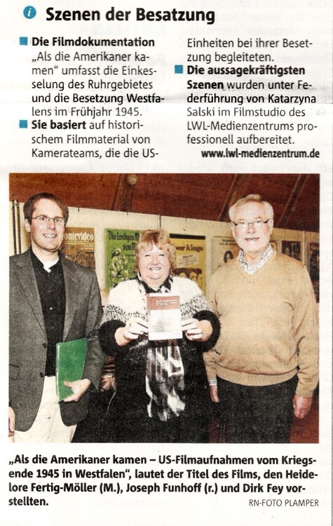 Dienstag, 20. Oktober 2015Binnen weniger Wochen besetzen amerikanische und britische Truppen im Frühjahr 1945 ganz Westfalen. Stadt für Stadt, Dorf für Dorf wurden zum Teil gegen erbitterten Widerstand, zum Teil auch kampflos erobert. "Eingebettet" in die vorrückenden Truppen drehten die US-Kameraleute zum Teil spektakuläre Bilder von Sieg und Niederlage, Ende und Neuanfang des Jahres 1945. Diese Filmaufnahmen, eine CD des Medienzentrums des Landschaftsverbandes Westfalen-Lippe (LWL) mit dem Titel: "Als die Amerikaner nach Westfalen kamen ..." sahen unsere Mitglieder zusammen mit den Mitgliedern des Fördervereins Stadtmuseum. Einleitende Erklärungen zum Film gab Herr Dirk Fey vom LWL. Nach Ende der Vorführung stand er noch Zeitzeugen für eine Gesprächsrunde zur Verfügung. Diese berichteten über ihre eigenen Erlebnisse vom Ende des 2. Weltkrieges. Dieser mehr als interessante Nachmittag begann in der Westfälischen Stube mit Kaffee und Kuchen.