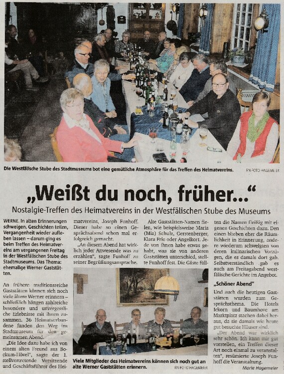 Der 1. stellvertretende Vorsitzende unseres Heimatvereins Joseph Funhoff hatte ins Heimatmuseum eingeladen. In der bis auf den letzten Platz besetzten Westfälischen Stube schilderte er eigene Erlebnisse aus den Gaststätten in Werne. Die Teilnehmer reicherten dies mit eigenen Geschichten und Informationen an, so dass ein recht guter Eindruck über eine vergangene "Kneipenszene" in unserer Heimatstadt entstand. Die Beiträge aller Beteiligten riefen allgemeine Heiterkeit hervor und regten die Gespräche untereinander ganz besonders an. In der Pause wurde ein typisch westfälisches Gericht gereicht - Pfefferpotthast - köstlich. Die sich anschließenden Gespräche - auch in kleinen Gruppen - förderte so manche Anekdote zu Tage. Fazit der Teilnehmer: Ein gelungener Abend - er sollte im kommenden Jahr wiederholt werden.