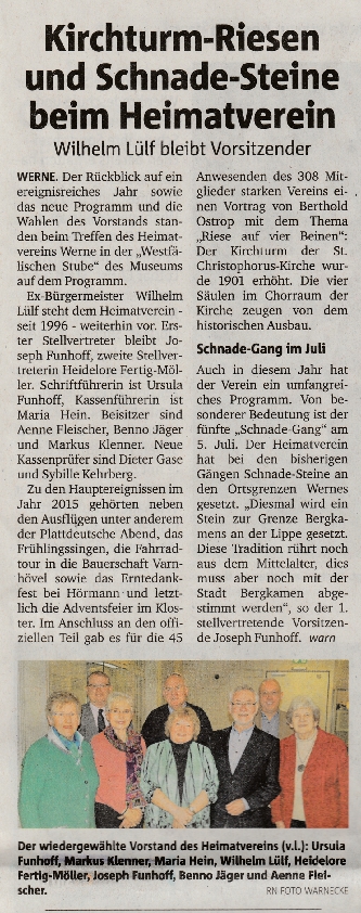 Der Vorsitzende unseres Heimatvereins, Wilhelm Lülf, hatte zur Mitgliederversammlung eingeladen. In der Westfälischen Stube des Heimatmuseums konnte er zahlreiche Mitglieder begrüßen. Danach wurde derer gedacht, die uns im letzten Jahr für immer verlassen haben. In seinen weiteren Ausführungen berichtete er über die Aktivitäten des vergangenen Jahres, wobei einige Veranstaltungen im Detail vorgestellt wurden. Besonders erfreulich ist die Mitgliederentwicklung. Mit 21 Neuzugängen in 2015 hat der Verein nun 308 Mitglieder. - Maria Hein, unsere Kassiererin, gab den Kassenbericht. Die Kasserprüfer Angelika Josefski und Heinrich Wittemeier gaben ihren Prüfbericht ab, bescheinigten Maria Hein eine einwandfreie Kassenführung und baten um Entlastung des Vorstandes. Diesem Antrag wurde einstimmig gefolgt. Da der Vorstand neu zu wählen war, übernahm Hans Weiß die Funktion des Wahlleiters. Er dankte dem Vorstand im Namen der Mitglieder für die geleistete Arbeit. Der Vorschlag zur Wiederwahl des 1. Vorsitzenden wurde einstimmig angenommen. Wilhelm Lülf bedankte sich und rief zur Wahl der weiteren Vorstandsmitglieder auf. Der alte Vorstand ist nun auch der neue Vorstand - einstimmig gewählt für die nächsten 3 Jahre.
