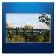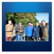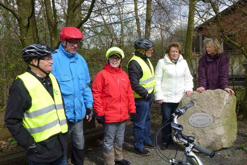 Unter diesen besonderen Vorzeichen starteten wir mit zirka 70 Heimatfreunden vom Parkplatz der Firma Böcker aus durch die Lippeaue in Richtung Rünthe. Dort erwartete uns unser Altbürgermeister und 1. Vorsitzende Wilhelm Lülf mit den Vertretern der Stadt Bergkamen, angeführt vom stellvertretenden Bürgermeister Kay Schulte und dem Ortsvorsteher von Rünthe Klaus Kuhlmann. Ein Begrüßungstrunk trug dazu bei, den Rückweg in lockerer Athmosphäre antreten zu können. Die Grenzmarkierung zwischen unseren beiden Städten erreichten wir auf der Brücke am ehemaligen Fischerhof.