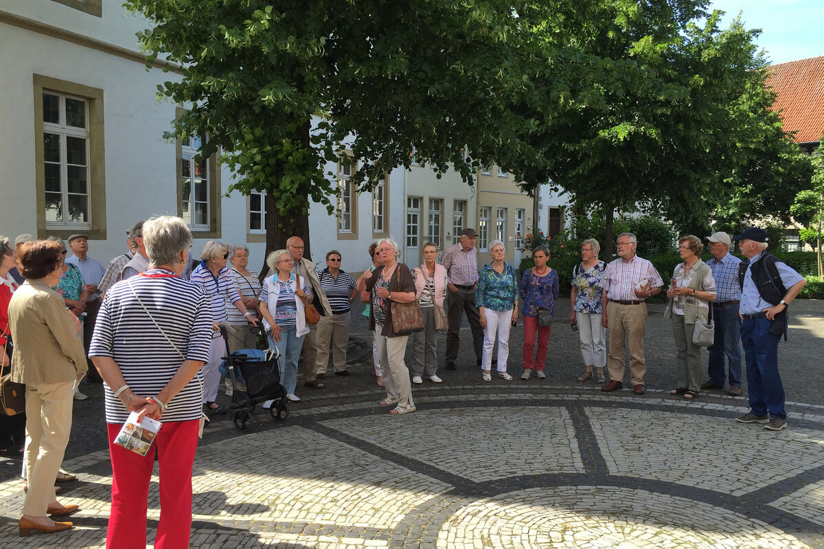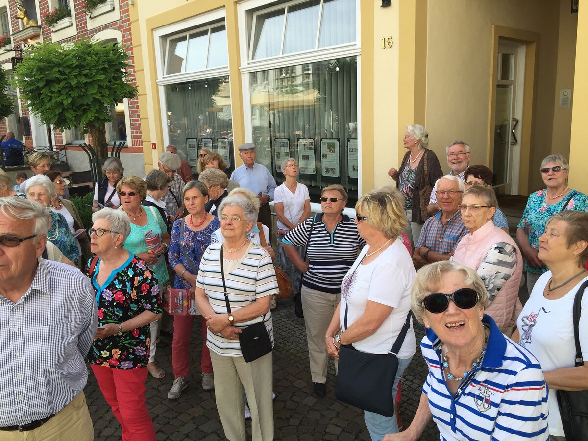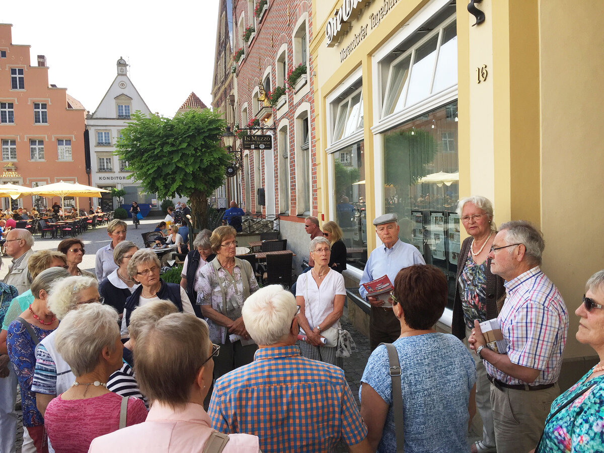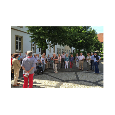 Sonne pur - ideale Voraussetzung für eine Stadtbesichtigung. Ziel unserer Bustour war die Pferdestadt Warendorf. Bei Kaffee und Kuchen oder einem Eisbecher konnten wir den Nachmittag genießen, bevor wir zu einer individuellen Stadtführung aufbrachen. Die 1. Vorsitzende des Warendorfer Heimatvereins, Frau Mechtild Wolff, zeigte uns innerhalb der Altstadt einige sehenswerte Gebäude und gab dazu spannende Erläuterungen zur Geschichte der Stadt. Den Abschluss bildete der Besuch im "Klassizistischen Bürgerhaus Klosterstraße 7" als ein Gebäude des dezentralen Stadtmuseums. Mit vielen interessanten Eindrücken traten wir die Rückfahrt an. Der Tag endete mit einem Spargelessen (wer mochte) im Landgasthaus "Mutter Stuff".