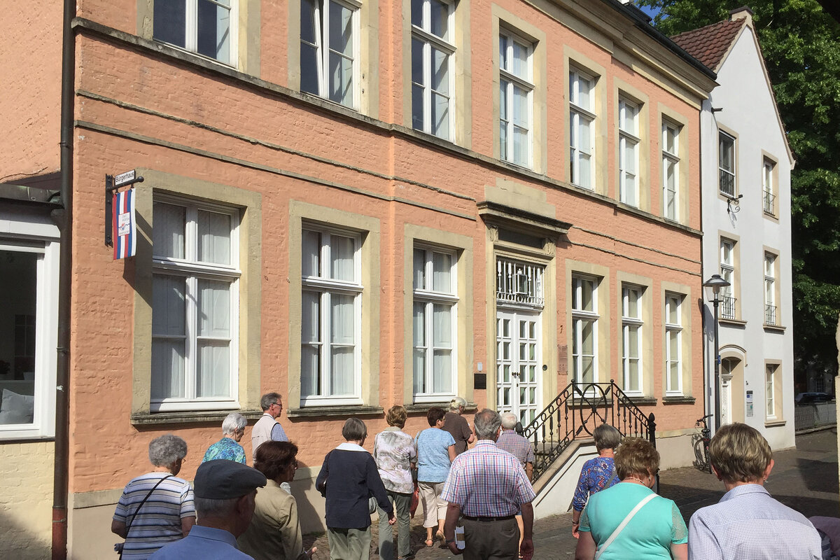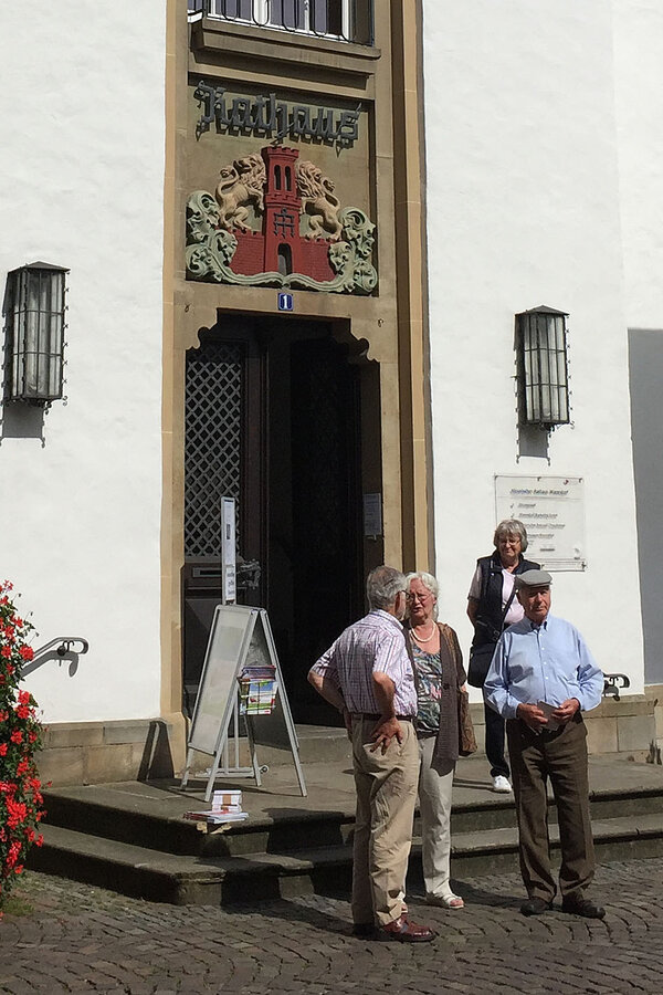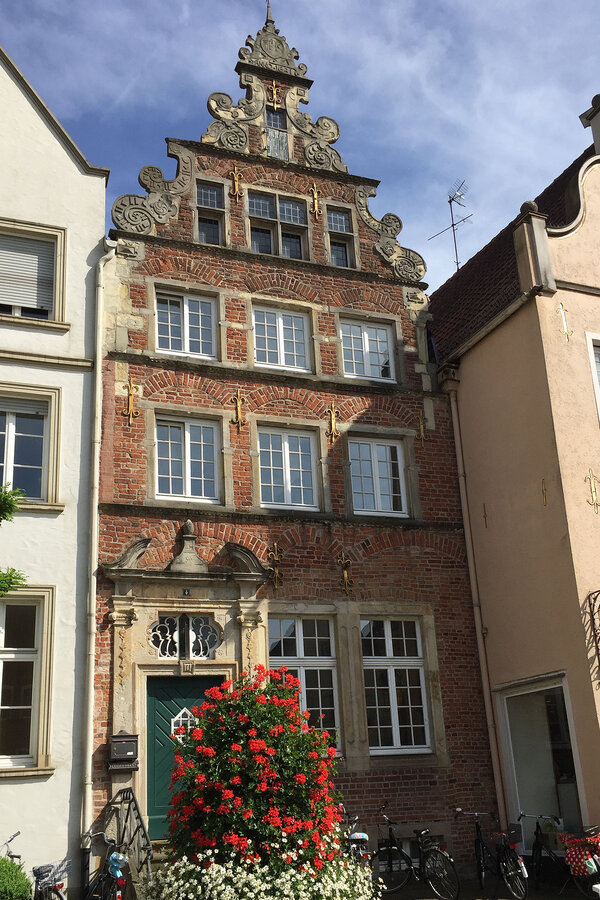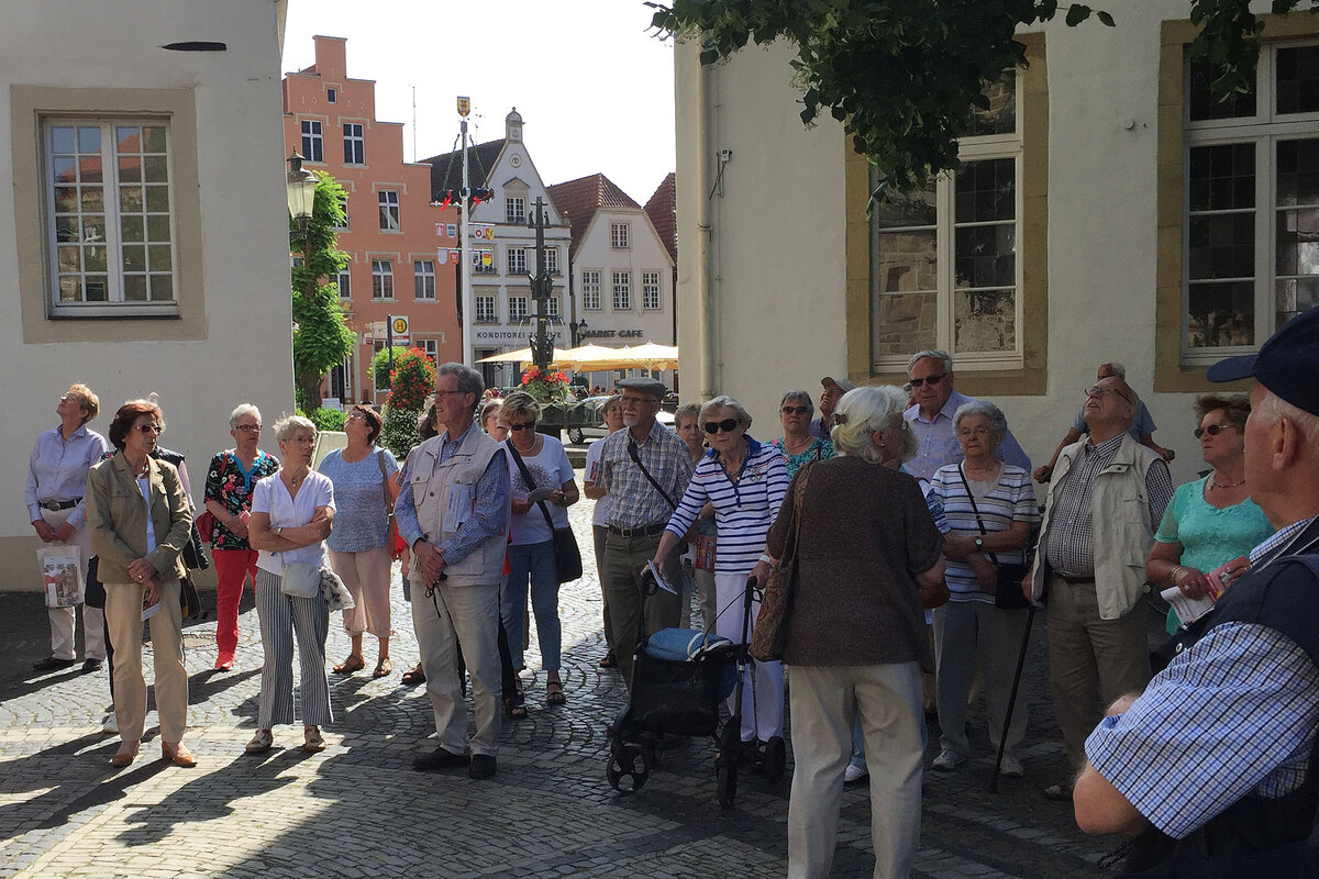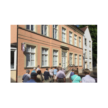 Sonne pur - ideale Voraussetzung für eine Stadtbesichtigung. Ziel unserer Bustour war die Pferdestadt Warendorf. Bei Kaffee und Kuchen oder einem Eisbecher konnten wir den Nachmittag genießen, bevor wir zu einer individuellen Stadtführung aufbrachen. Die 1. Vorsitzende des Warendorfer Heimatvereins, Frau Mechtild Wolff, zeigte uns innerhalb der Altstadt einige sehenswerte Gebäude und gab dazu spannende Erläuterungen zur Geschichte der Stadt. Den Abschluss bildete der Besuch im "Klassizistischen Bürgerhaus Klosterstraße 7" als ein Gebäude des dezentralen Stadtmuseums. Mit vielen interessanten Eindrücken traten wir die Rückfahrt an. Der Tag endete mit einem Spargelessen (wer mochte) im Landgasthaus "Mutter Stuff".