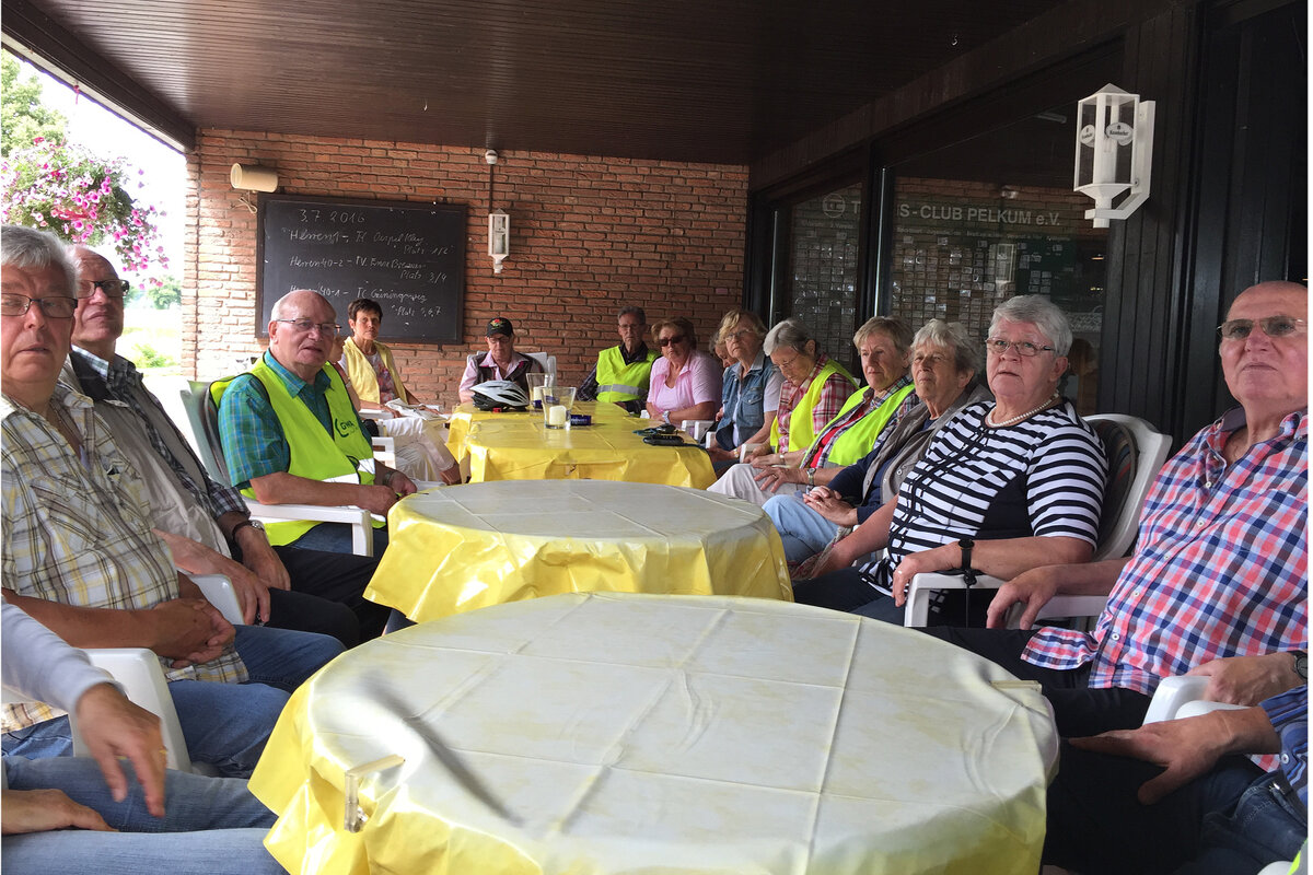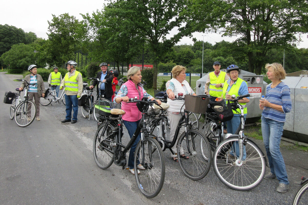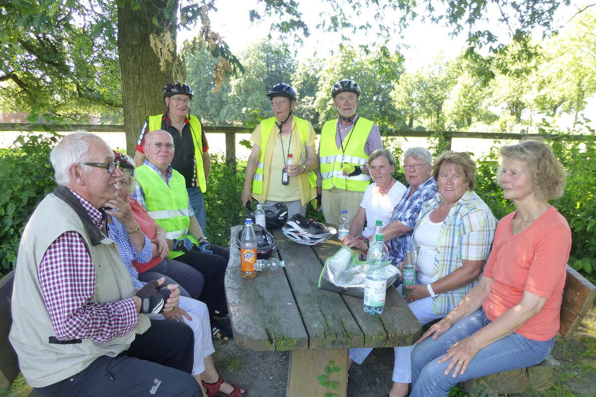 Mit 23 Teilnehmern führte unsere 4. Fahrt ins Blaue mit dem Rad unter Leitung von Erika Brokamp durch die Lippewiesen in Richtung Herringen. Von dort aus ging es nach Pelkum, wo beim Tennisclub Pelkum e.V. eine Pause eingelegt wurde. Die Fahrt führte uns dann am Haus Reck vorbei nach Overberge, von wo über die ehemalige Bahntrasse Werne angesteuert wurde. Der Tachometer zeigte 28 km an.