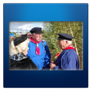 Zum Empfang schenkte unsere 2. stellvertretende Vorsitzende Heidelore Fertig-Möller als Kiepenkerl mit ihren Helferinnen und Helfern einen Münsterländer Korn oder Aufgesetzten ein. Das Bild auf der Brücke rundeten weitere Kiepenkerle und eine Möhn aus den benachbarten Orten ab.