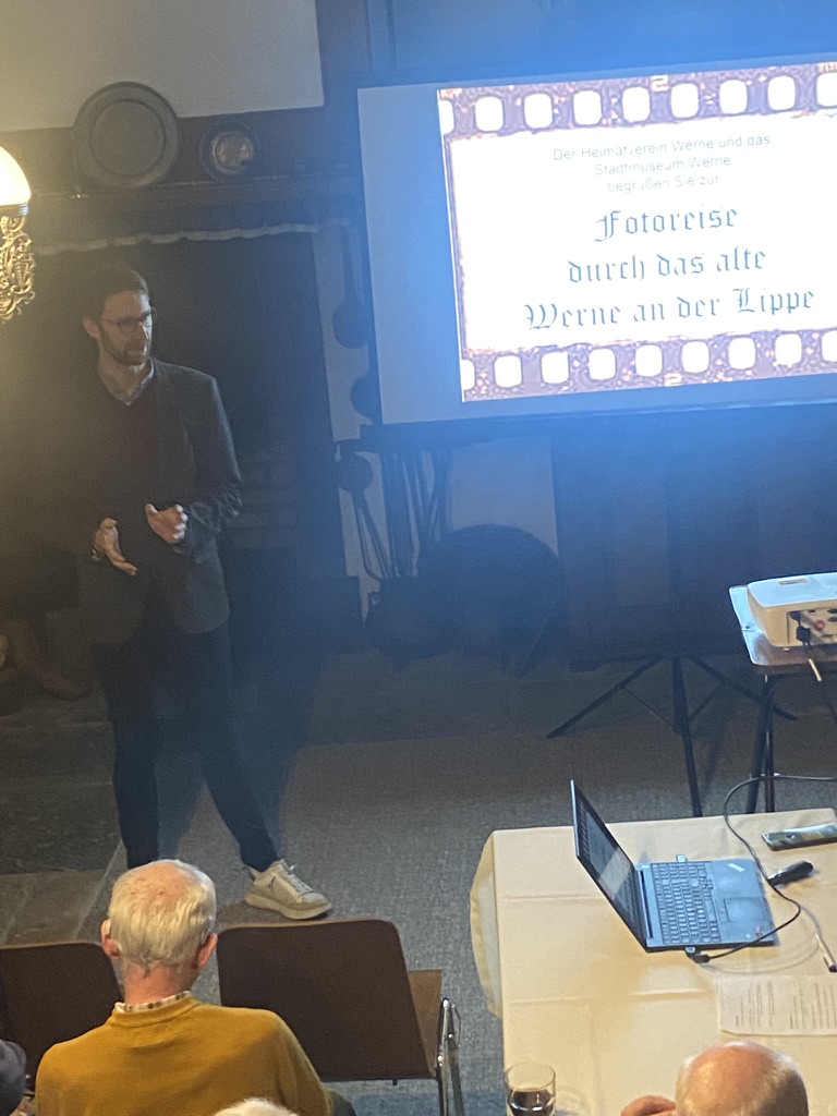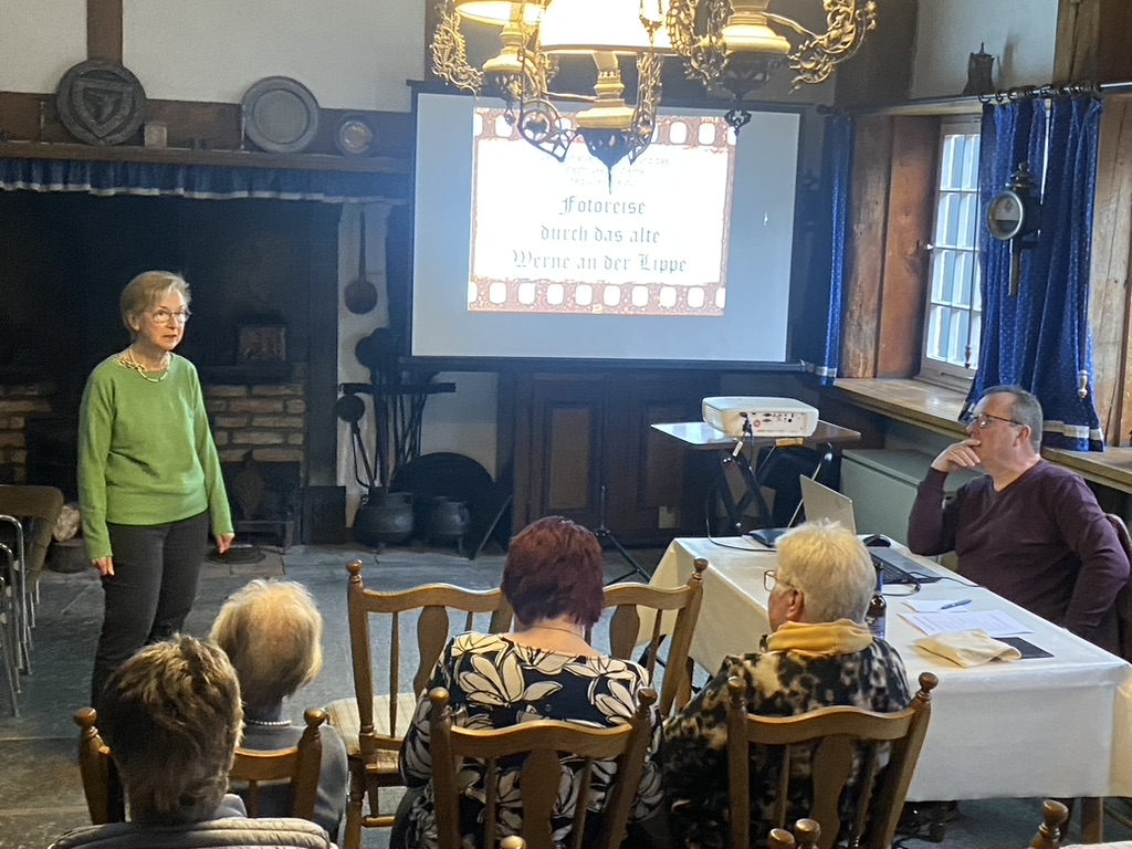 Die Fotoreise durch Werne in der Westfälischen Stube des Museums war wieder gut besucht. Im Fokus stand diesmal die Bauerschaft Horst, und einige der Besucher waren genau aus diesem Grunde gekommen. Herr Herbert Schulze Geiping, Heimatkundler mit Schwerpunkt Horst, führte anhand von alten Fotos und Gebietskarten durch den Abend. Er begann mit den ersten geschichtlichen Spuren ab circa 1300, sponn dann den Faden weiter über die nachweisbaren Rittergüter und die ersten Kapellen zur ersten Schule im Jahr 1753. Als der Landkreis Lüdinghausen 1816 gegründet wurde, übernahm Johannes D. von Schlebrügge das Amt des ersten Landrates. Er wohnte auf dem Adelssitz Beckendorf in Horst. Auf Luftbildern kann man heute anhand von Bodenverfärbungen die ehemaligen Gräften und Grundrisse der Burganlagen dieses Adelssitzes noch erkennen. Dann folgten viele alte Fotos von Bauernhöfen, Kötterhäusern. Manchmal waren die ausgeübten Berufe wie Schmied, Zimmermann oder Stellmacher noch erkennbar. Es folgte das Schulwesen in seiner Entwicklung bis zum heutigen Tag mit der gemeinschaftseigenen Kita und ihrer Turnhalle. Dabei wurden insbesondere bei den Horster Besuchern viele Erinnerungen ausgepackt. Schützenkönige und das Dorfgemeinschaftshaus durften am Ende nicht fehlen.