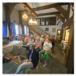 Ab 13:00 Uhr startete auf dem Kirchhof das Familienfest, bei dem die ältere Generation gerne im Schatten der Bäume zusammensaß. Für Leben und Aktivität sorgten die vielen Kinder. Das Museumsteam lockte sie erst mit Rätselspielen durch die Ausstellung, dann gab es zur Belohnung Waffeln am Spieß und Schminken als Prinzessin, Tiger, Löwe oder Traumkind. Sowohl bei der Pflanzensuche auf der Museumswiese, als auch am Handwerkerstand für das Basteln von Insektenhotels, war der Andrang groß. Alle Helferinnen und Helfer, auch beim Mal- und Stickerstand, hatten über den ganzen Nachmittag alle Hände voll zu tun. Als die Feier gegen 18:00 Uhr zu ihrem Ende kam, schauten viele Besucher noch gerne auf die Fotoschau, die im Schaufenster des Museums über einen großen TV-Bildschirm lief.